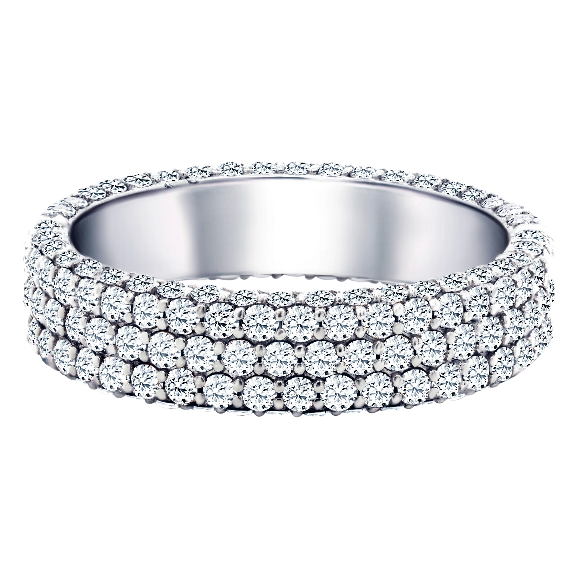 Featuring three meticulously aligned rows of lab-grown diamonds that wrap around the entire band, this ring offers unmatched sparkle with a clean, symmetrical look. Crafted in solid 14k gold, it’s perfect as a glamorous wedding band, a bold stackable ring, or a special anniversary gift. Its low-profile setting ensures comfortable everyday wear while maintaining a high-impact appearance.
